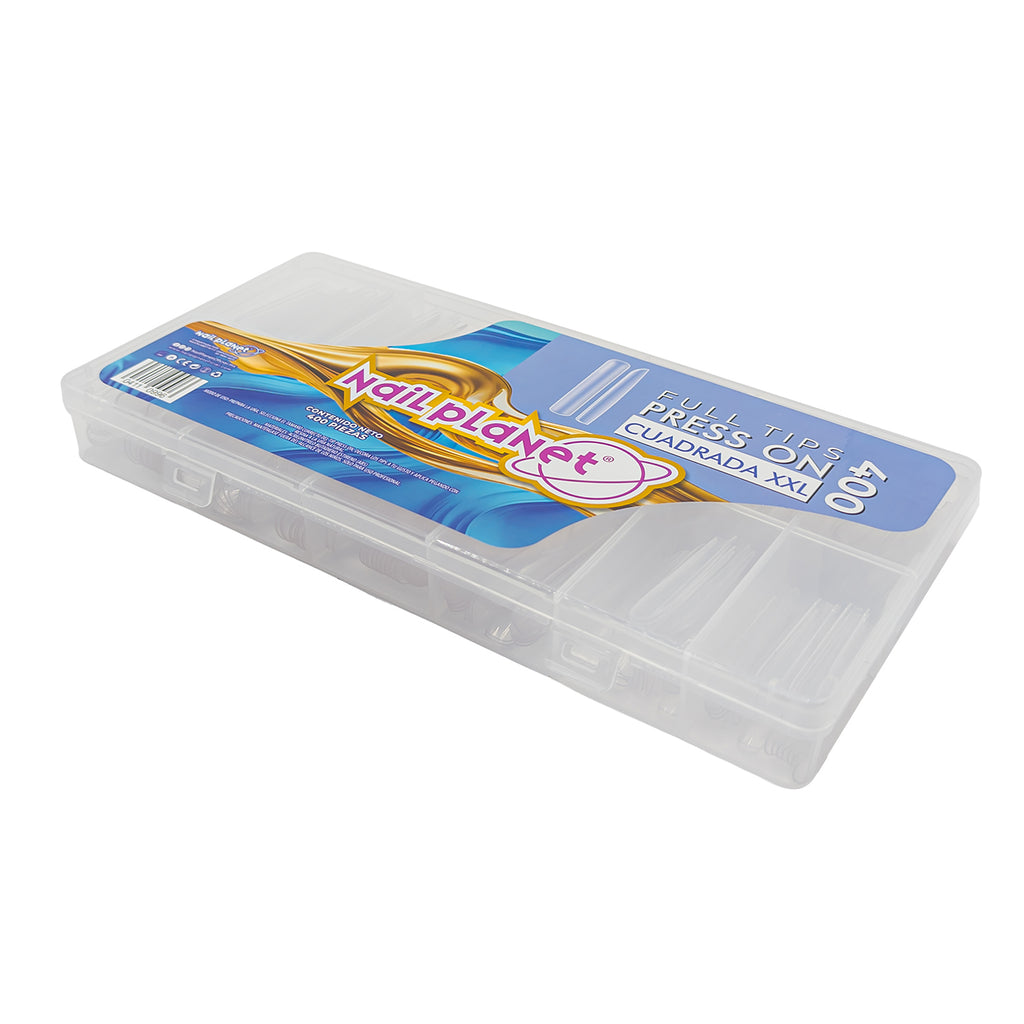 Tips de plástico o gel preformadas que se adhieren a la uña natural para crear un soporte para la uña postiza. Técnica de aplicar uñas postizas a presión que cubre completamente la uña natural desde la cutícula hasta el borde libre, en lugar de solo extenderla parcialmente. Se pueden aplicar en minutos, sin necesidad de herramientas o conocimientos técnicos. Este método permite obtener un aspecto profesional y duradero, sin la necesidad de un gel o acrílico, lo que lo convierte en una opción rápida y fácil para lograr una manicura.