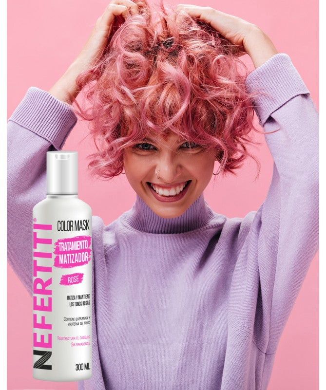 Color Mask Rose de Nefertiti matiza y mantiene los tonos rosas del cabello. Contiene Queratina y Proteína de Trigo que reestructuran el cabello. Debe aplicarse en cabello decolorado, entre más alta la etapa de decoloración será mejor el resultado.