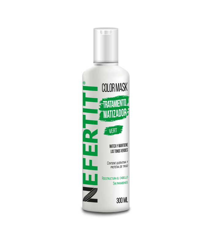 Color Mask Vert de Nefertiti matiza y mantiene los tonos verdes del cabello. Contiene Queratina y Proteína de Trigo que reestructuran el cabello. Debe aplicarse en cabello decolorado, entre más alta la etapa de decoloración será mejor el resultado.