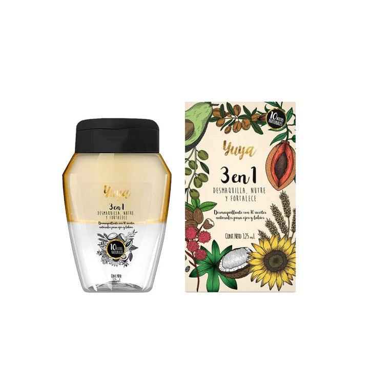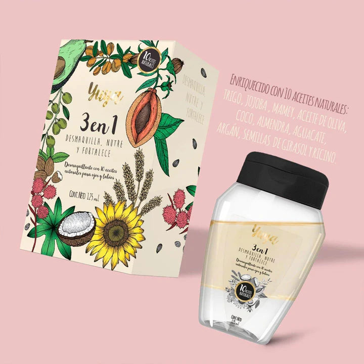 Desmaquillante 3 en 1 con 10 aceites naturales, ayuda a remover máscara de pestañas a prueba de agua, maquillaje para cejas y labiales de larga duración sin irritar tu piel.